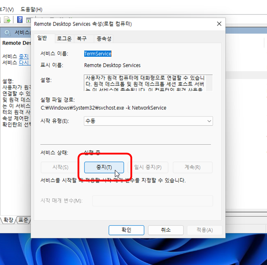 해당 서비스 창에서 중지버튼을 클릭하여 Remote Desktop Services를 중지 시킵니다.