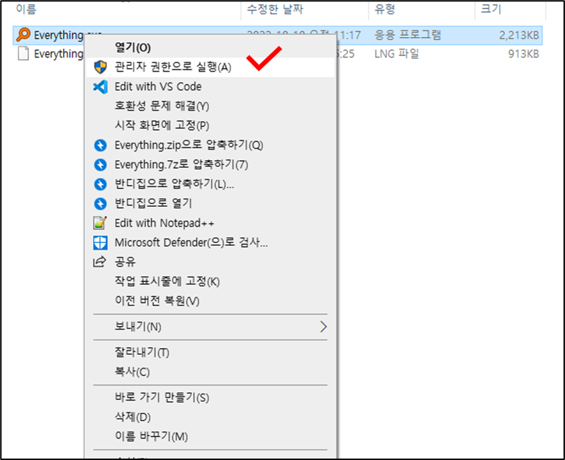 Eveything 을 사용하기 위해서는 먼저 관리자 권한으로 실행 해야합니다. 돋보기 아이콘 Everything 에 마우스 커서를 두고 오른쪽 버튼을 클릭합니다.