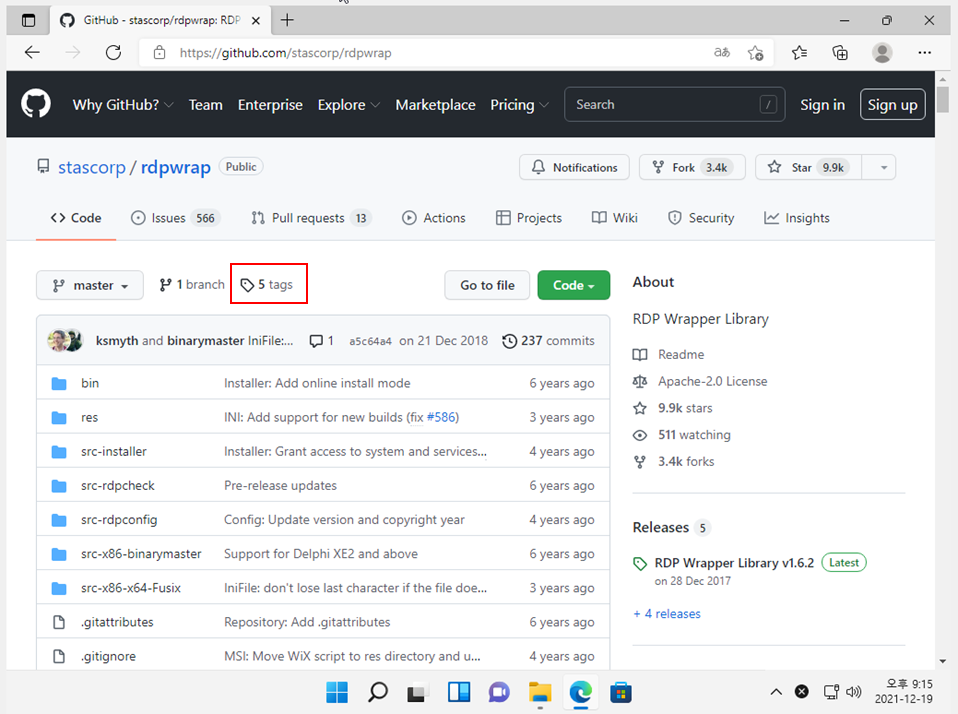 3. 최신버전 선택(RDP Wrapper Library v1.6.2, 2021-12-21 기준)