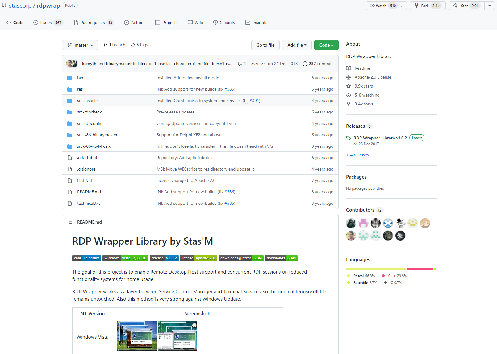 하지만 러시아에 있는 Stas'M Corp. 회사에서 윈도우 Home Edition 버전을 사용하는 사용자들에게 원격 데스크톱을 할 수 있게 RDP Wrapper Library(RDPWrap) 를 무료로 지원해주고 있습니다.(https://github.com/stascorp/rdpwrap)