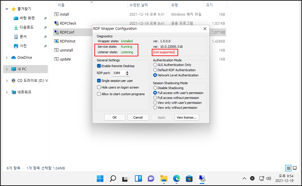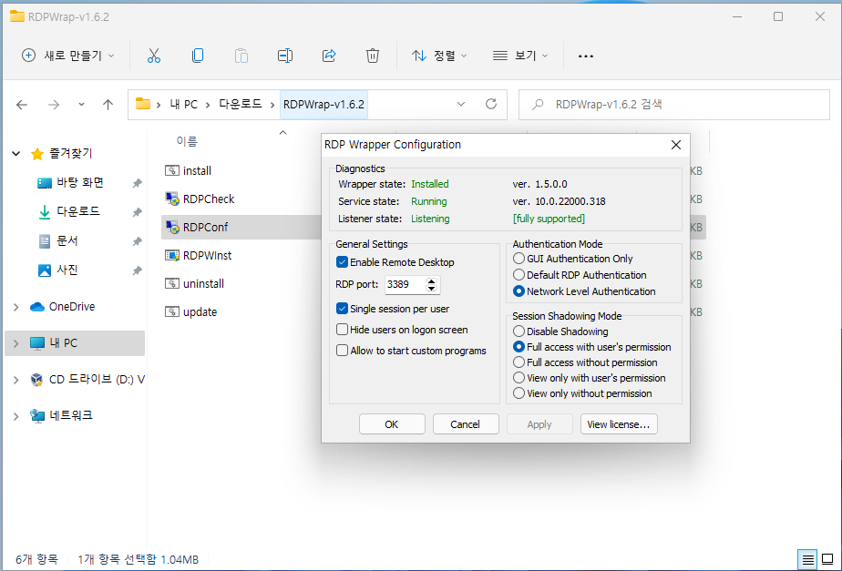 RDPWrap 설치가 완료 되었다면 RDPConf 파일을 이용하여 설치 상태를 확인할 수 있다.