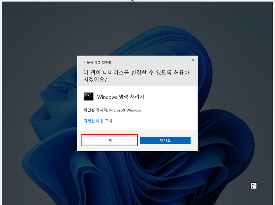 "게시자를 알 수 없는 이 앱이 디바이스를 변경할 수 있또록 허용하시겠습니까?" 파일 경고에서 "예"를 클릭