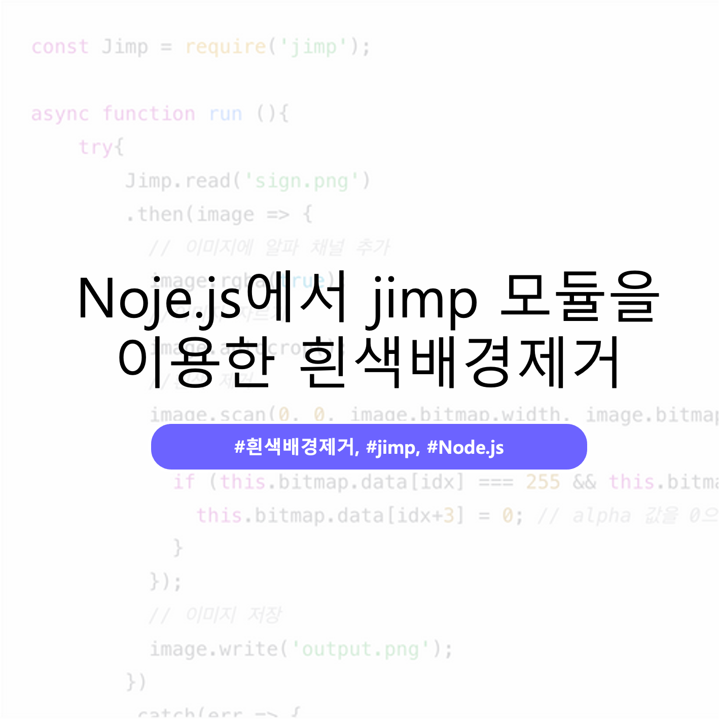 아래코드는 jimp 모듈을 이용하여 사용하였습니다. jimp 모듈은 이미지처리 모듈이며 의존성 있는 다른 모듈이 없어서 설치 및 사용에 매우 용의 합니다. 파일도 읽는 함수도 포함되어 있어서 모듈만 설치하면 바로 적용할 수 있습니다.
