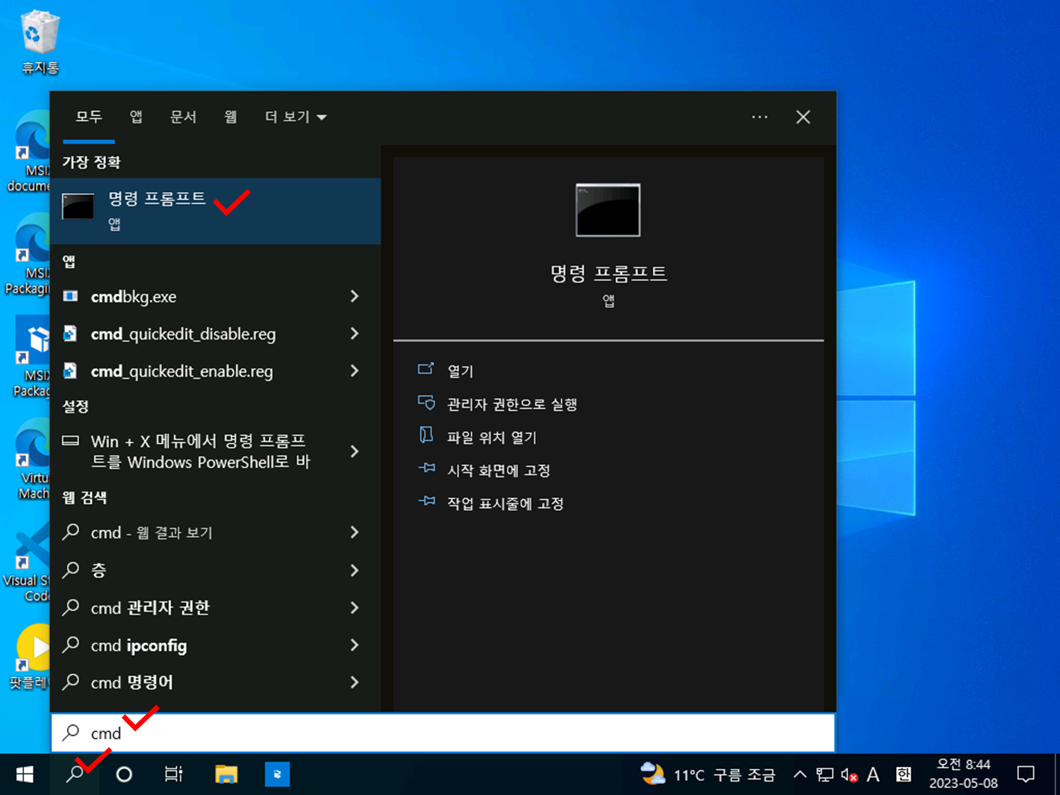 윈도우 돋보기를 클릭하고 CMD를 입력하여 명령프롬프트를 실행합니다.