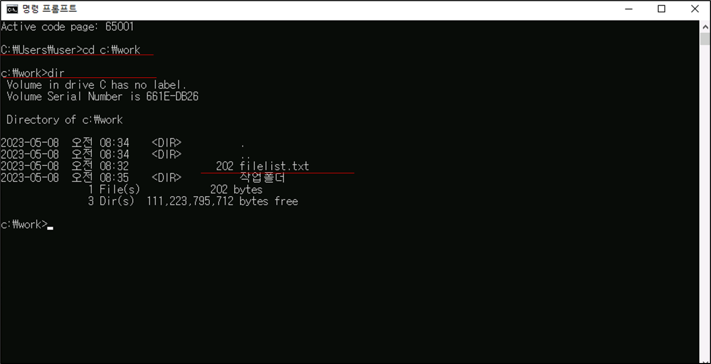 이제 사전에 작성한 삭제파일 리스트(filelist.txt) 파일이 있는 경로로 이동합니다. 저는 c:\work폴더에 저장을 하여 해당 폴더로 이동하였습니다.