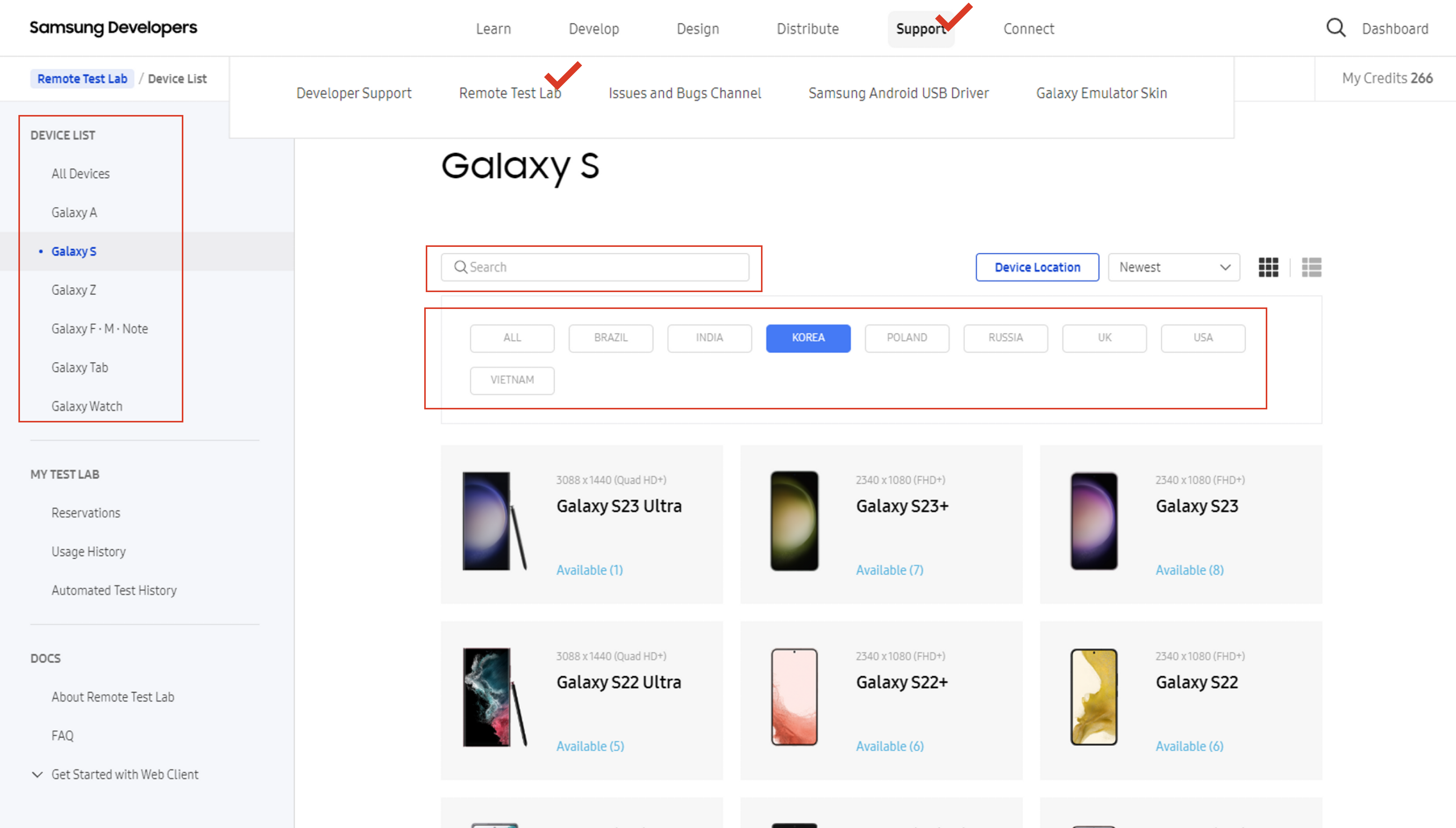 해당 사이트에 접속을 하고 회원가입을 합니다. 그리고 상단에 Support - Remote Test Lab에 접속합니다.