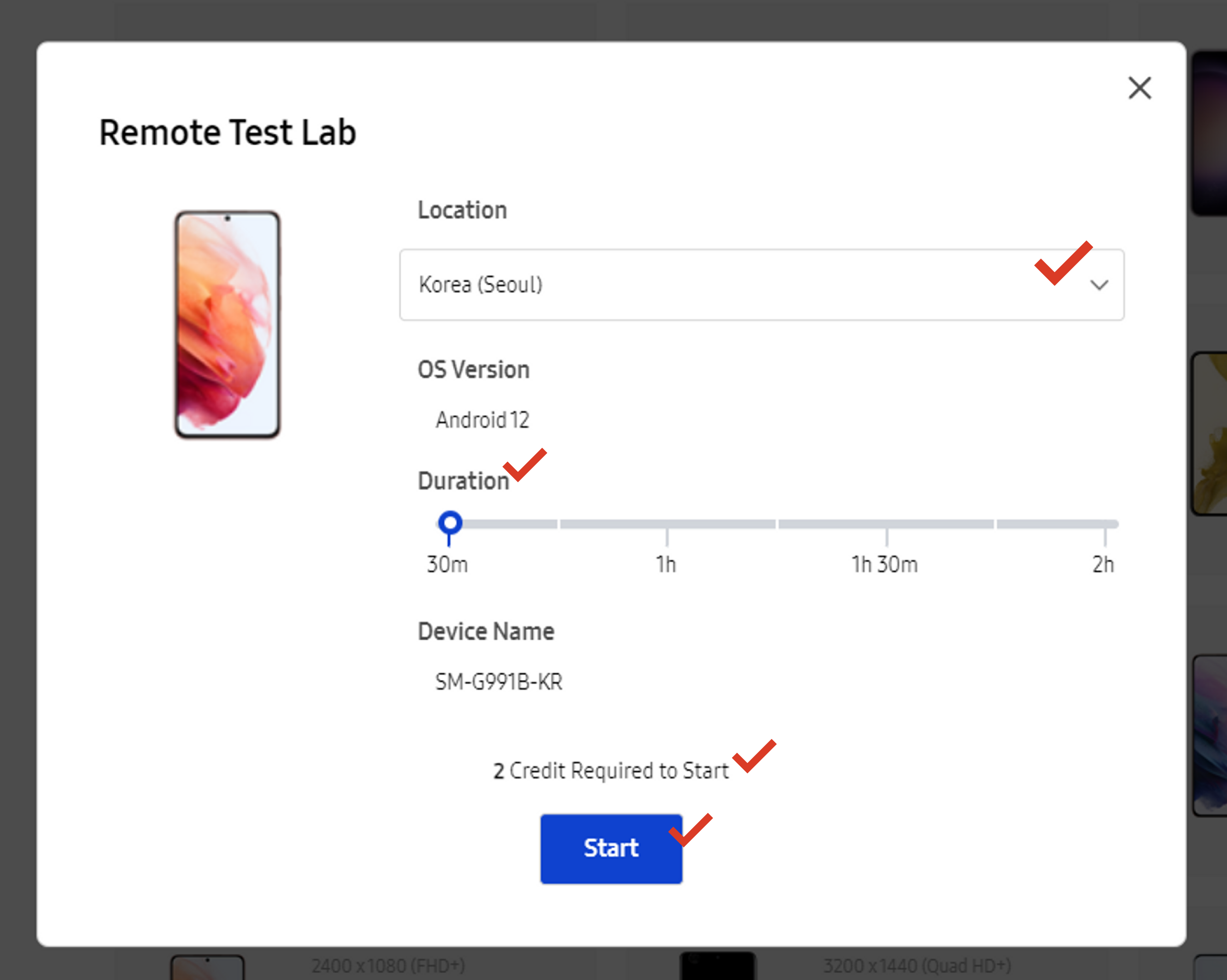 테스트할 기기를 선택하면 원격 접속할 국가를 가장가까운 곳으로 선택합니다. 그리고 Duration에서 테스트할 기간을 선택합니다. 그리고 해당 크레딧이 얼마나 소모 되는지 확인하고 Start 버튼을 클릭합니다.