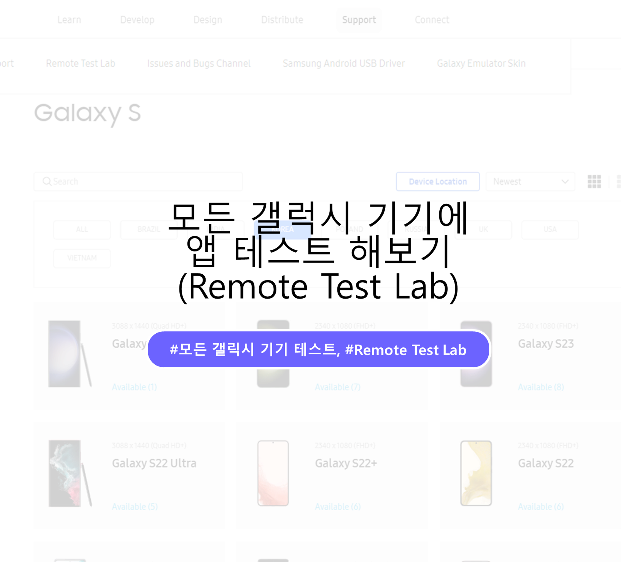 안드로이드 앱을 개발하고 배포를 진행 했는데 한 사용자가 앱에 오류가 있다고 이메일이 왔습니다. 사용자 기기를 확인해보니 갤럭시 노트4. 기본적인 기기정보에 안드로이드 버전과 API 버전을 확인했지만 실제 기기 갤럭시노트4기기에서 앱을 설치해고 상태를 확인해보고 싶었습니다. 실제 폰을 구하려고 하였지만 바로 구하기 어려운 상황이어서 어떻게 하면 사용할지 확인해보니 마침 Samsung Devlopers에서 Remote Test Lab을 통해 실제 스마트폰 기기를 원격으로 테스트 할 수 있는 서비스를 제공하고 있었습니다. 또한 APK도 쉽게 설치할 수 있게 제공하고 있었습니다.
